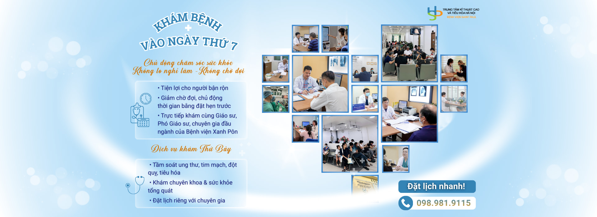 Thăm khám và điều trị tại Trung tâm Kỹ thuật cao và Tiêu hóa Hà Nội – Bệnh viện Đa khoa Xanh Pôn. Người bệnh sẽ được trải nghiệm các dịch vụ chăm sóc sức khỏe chất lượng cao, khám tầm soát ung thư sớm, chẩn đoán chính xác điều trị hiệu quả,… đạt tiêu chuẩn châu Âu và quốc tế. Dịch vụ y tế chuyên môn cao và y đức chuẩn mực của bệnh viện công giữa lòng Hà Nội. Chắc chắn quý vị sẽ hài lòng khi tới đây.
